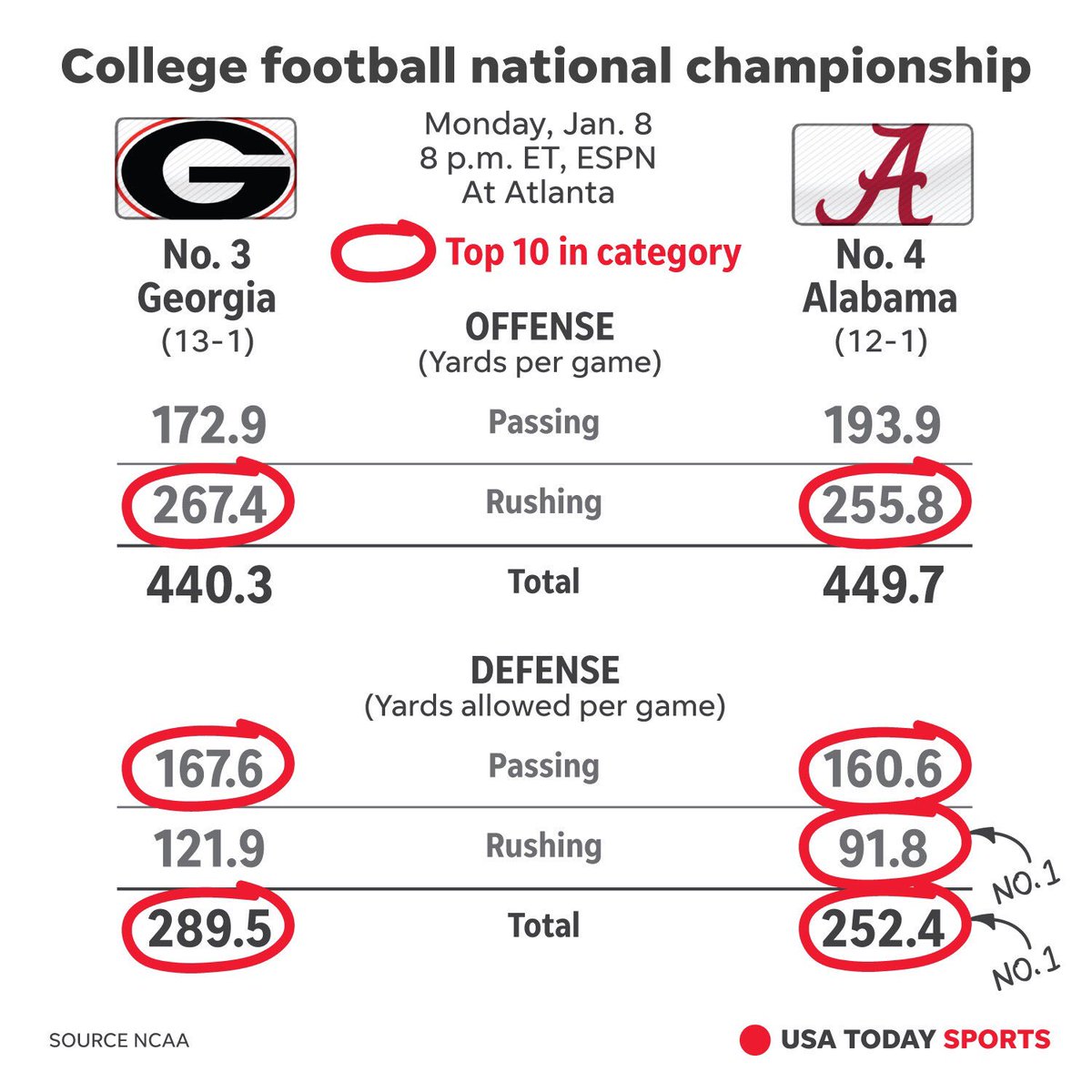 It’s time! The #CFPNationalChampionship is about to start. Here’s how Georgia and Alabama stack up.pic.twitter.com/ucSr8EBVdM
