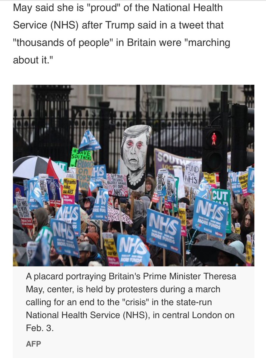 “Britain hits back” and the article describes May’s pride in Britain’s “beloved NHS”. And yet the article runs with a photo of the British marching in protest of the NHS’s failings?! I know doc’s who practiced there and patients from there. It’s really not all that “beloved.”pic.twitter.com/QHRc38OeDl