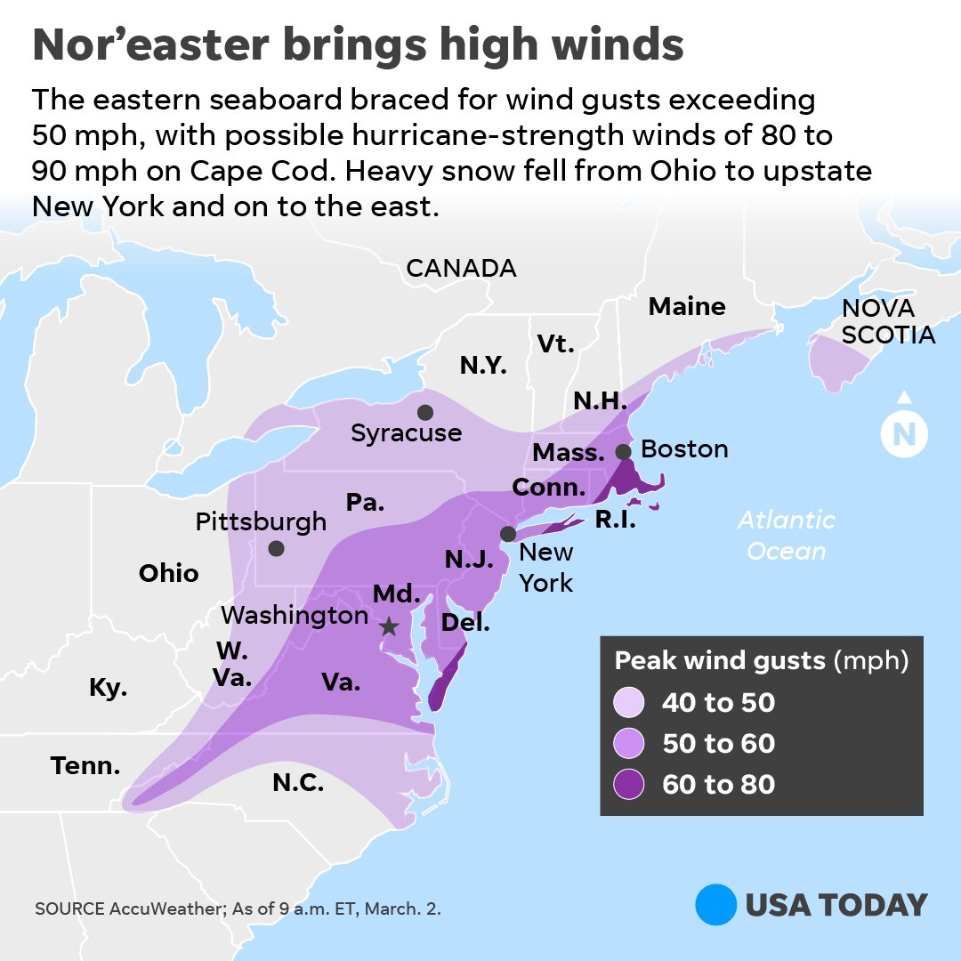 A major #noreaster slams the East Coast from Georgia to Maine, bringing heavy rain, severe flooding, snow and the threat of hurricane-force winds in some coastal areas. https://usat.ly/2oIpX9E  #windmageddonpic.twitter.com/XgSQwxYgKu