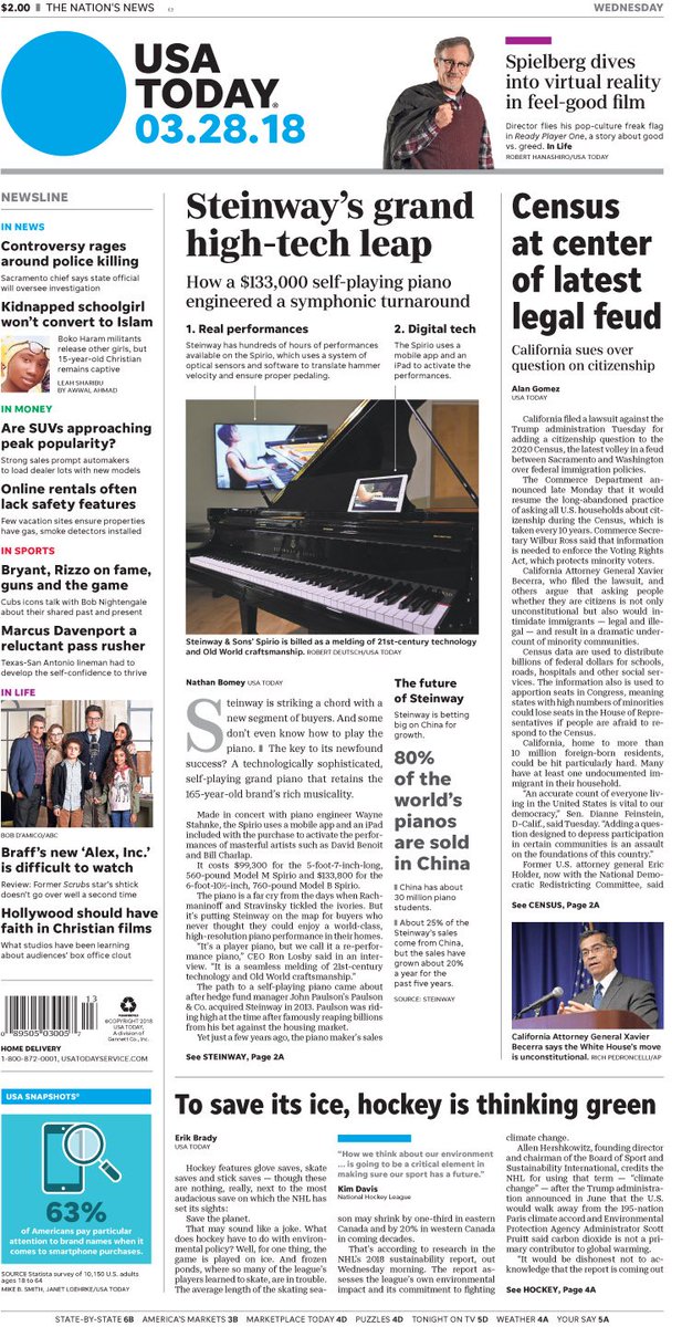 A look at Wednesday's paper: To save its ice, hockey is thinking green; Spielberg dives into virtual reality in feel-good film @readyplayeronepic.twitter.com/Eavr6R3EFG