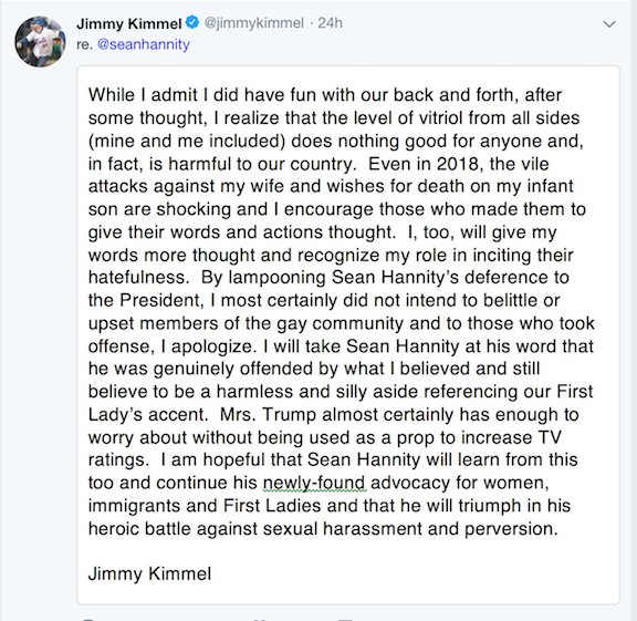 @JimmyKimmelLive to@seanhannity . Hopefully they both will use their public platforms and behave as role models for the rest of us and continue their newly-found advocacy against harassment and perversion.pic.twitter.com/Hlfc1yfTRA