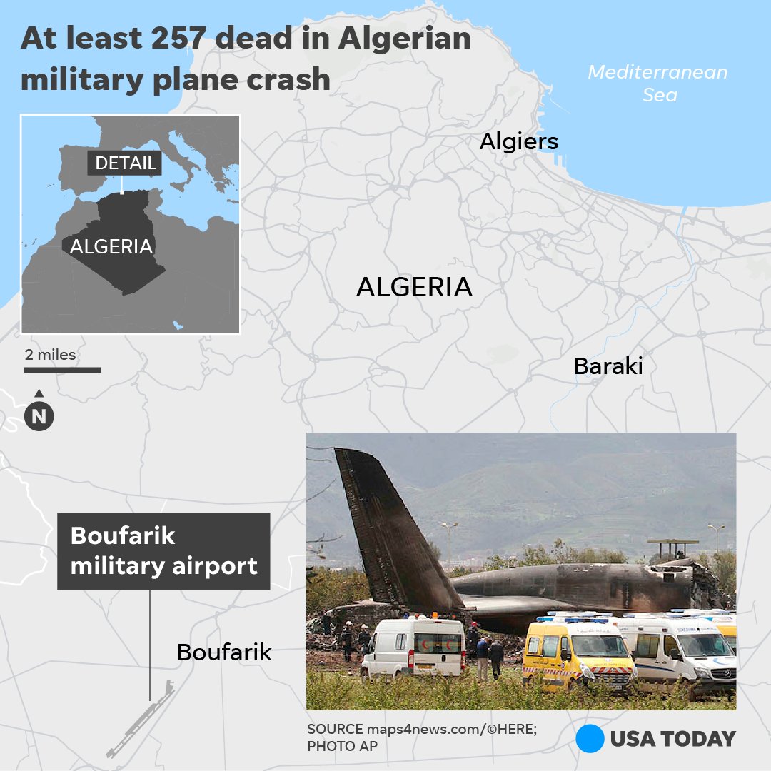 The Algerian plane went down near the Boufarik military base, which is 20 miles from the capital, Algiers, and close to the Mediterranean Sea. https://usat.ly/2qoYBq8 pic.twitter.com/3Lh9QsZJy7