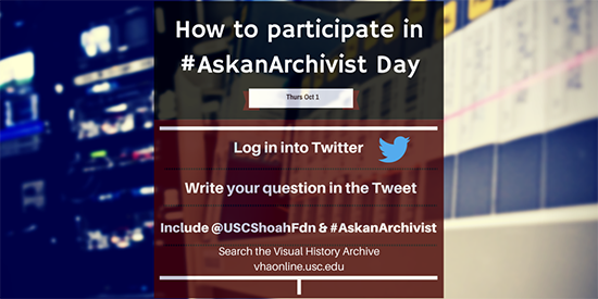 Today is your chance to ask an archivist from @USCShoahFdn anything you want! #AskAnArchivist http://ow.ly/SRddx pic.twitter.com/YrMxLaHPte