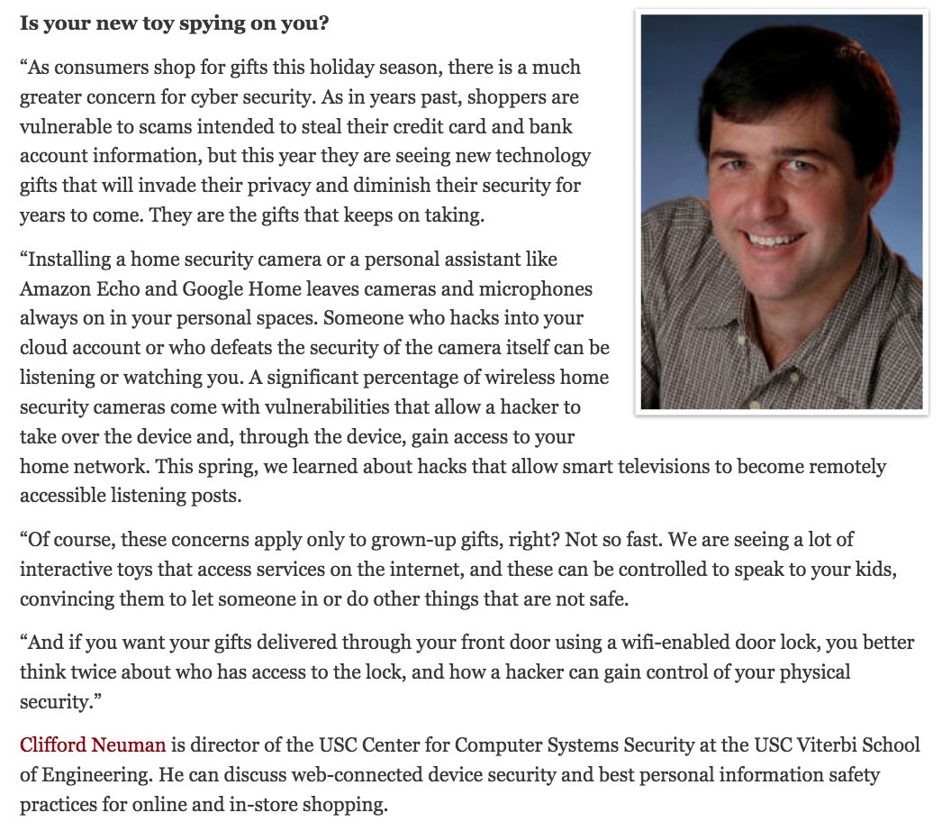 So many cool tech toys ... so many security risks says Clifford Neuman of @USCViterbi #BlackFridaypic.twitter.com/3TstREUmd3