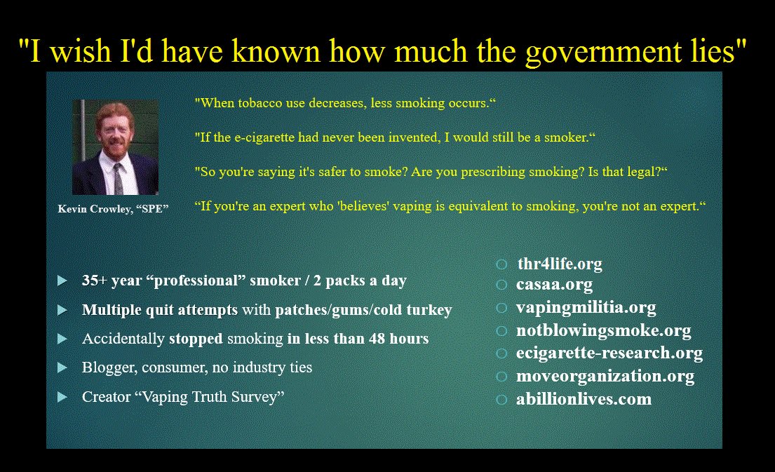 And I would like to add one word that tobacco control will never understand. Pleasure Yes Vaping gives me and others Pleasure, somthing missing from patches and gum. It's all about the users experience, and that it why vaping works.