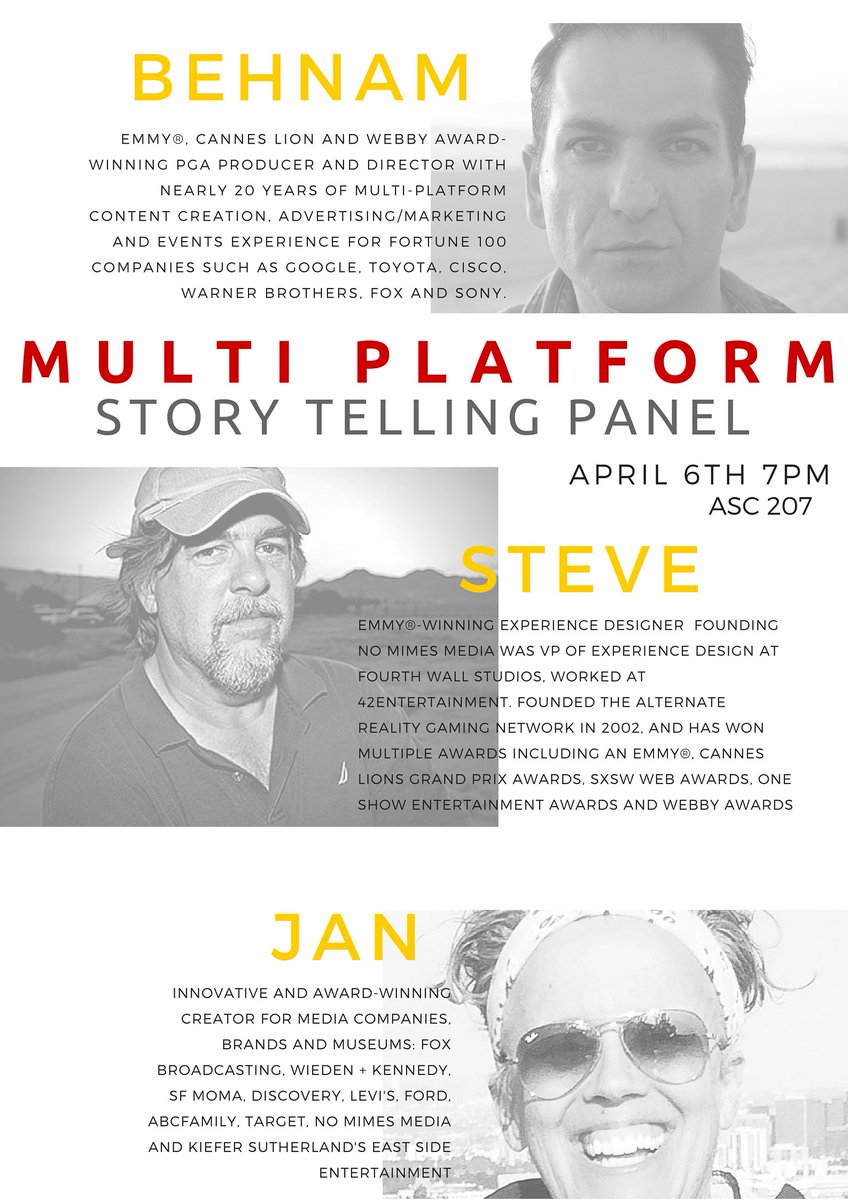 We have a great Multi Platform Story Telling Panel scheduled tonight. We hope to see you there! ASC 207 7pm