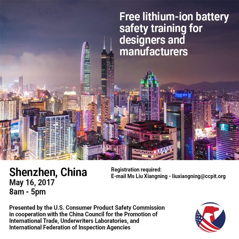 CPSC is hosting a free safety training for lithium-ion battery designers/manufacturers in Shenzhen, China: http://bit.ly/2ptMsAS pic.twitter.com/01ETjXaYeh