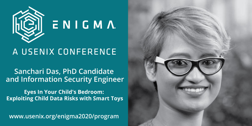 #enigma2020:@SanchariDecrypt PhD Candidate@IndianaUniv & Info Sec Engineer, presents "Eyes In Your Child's Bedroom: Exploiting Child Data Risks with Smart Toys" http://bit.ly/enigma2020das REGISTER NOW: http://bit.ly/enigma2020#infosec#security#privacy#cybersecuritypic.twitter.com/fb4xZxjrPJ