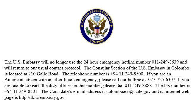 ශ්රී ලංකාවේ එක්සත් ජනපද තානාපති කාර්යාලය සහ සියලු ඇමරිකානු පියස් අප්රේල් 26 දින දක්වා මහජනයා සදහා වසා තබනු ලැබේ. හදිසි ඇමරිකානු පුරවැසි සේවා ක්රියාත්මක වෙයි. හදිසි නිවේදන පිළිබද අවධානයෙන් සිටින්න. සංචාරක උපදේශනය නොවෙනස්ව පවතී. https://travel.state.gov/content/travel/en/traveladvisories/traveladvisories/sri-lanka-travel-advisory.html …