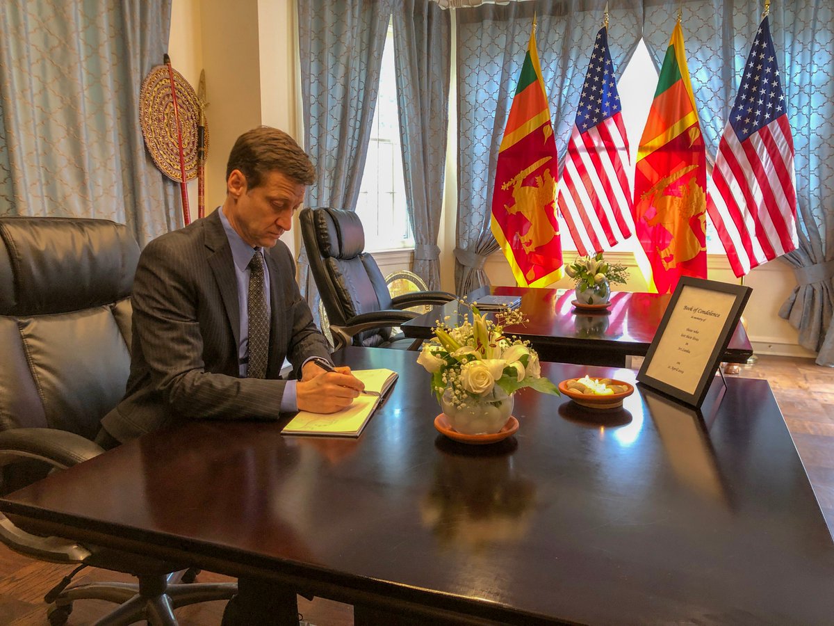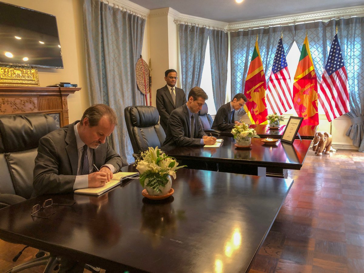 @StateDept#SriLanka team visited@EmbassyofSL today to sign the condolence books honoring the victims of Sunday’s Easter attacks. The U.S. stands with Sri Lanka following this horrific tragedy.#EasterSundayAttacksLKpic.twitter.com/HITPOlIpB3