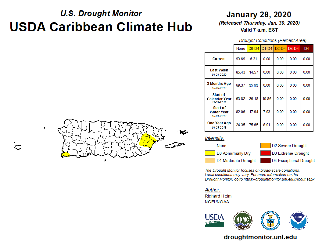 #Drought Monitor update Jan 28, 2020. Above-normal rain fell across southern and eastern Puerto Rico this week. With wet conditions for the last 1 to 2 months, D0 was pulled back in eastern Puerto Rico. Drought Map: http://caribbeanclimatehub.org/resources/drought-monitor-map/ …pic.twitter.com/khgzdNhjzF