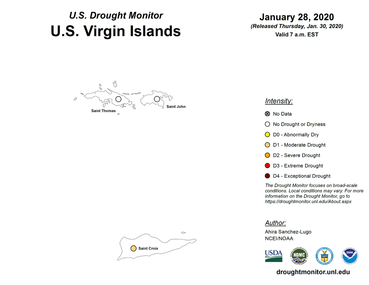 #Drought Monitor update Jan 28, 2020. Moderate drought persists on St. Croix. St. John and St. Thomas remain drought free. USVI Drought Map with full summary: http://caribbeanclimatehub.org/resources/drought-monitor-map/#usvi-drought …#USVIpic.twitter.com/0p8lcOWmb6