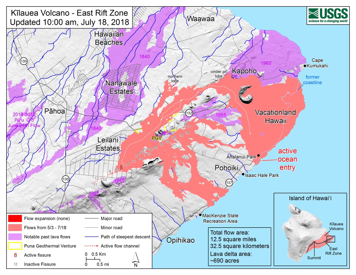 #Kilauea#LERZ update.#Fissure8 channel produced#lava overflows threatening homes on#Nohea in#LeilaniEstates. Southern#oceanentry margin at#Pohoiki Beach#Secrets surf spot & 700 m from#IsaacHalePark boat ramp. https://volcanoes.usgs.gov/volcanoes/kilauea/status.html …#KilaueaErupts#KilaueaEruptionpic.twitter.com/pJK5b5WIxo