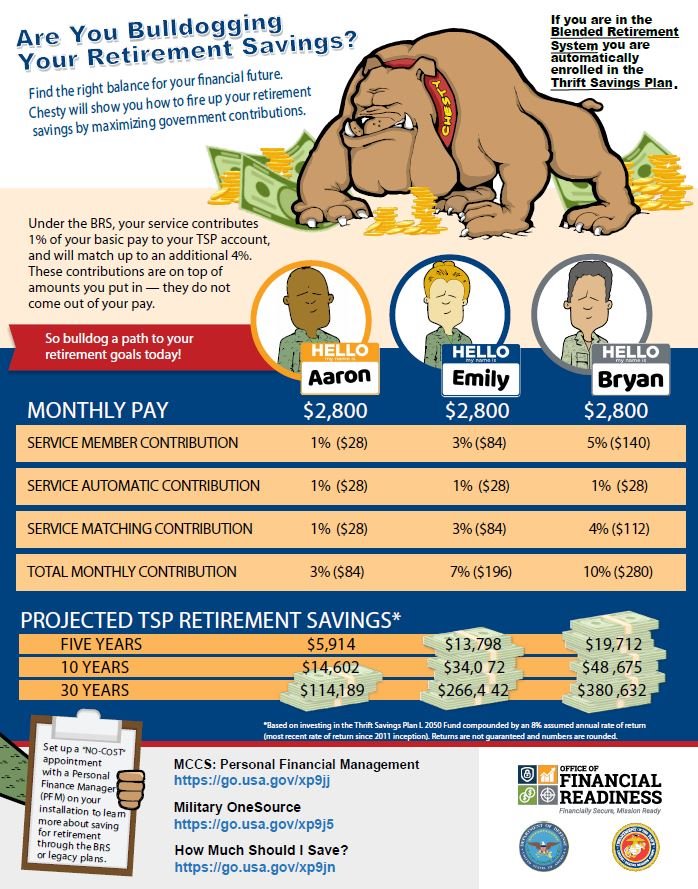 Are you missing out on free money for your retirement? If you're in the Blended Retirement System, the government will pay up to 5% to your TSP account based on your contributions. See how contributing to your TSP can help max out your financial future.pic.twitter.com/SHE6PmFlPd