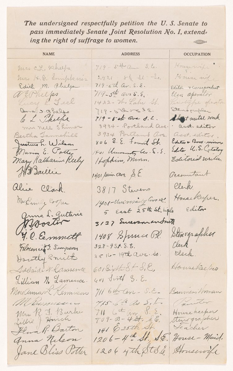 The struggle for woman suffrage grew into a mass movement supported by women from diverse backgrounds. Editors, elevator operators, housekeepers, accountants, and clerks signed this 1913 petition. #19thAt100 #RightfullyHerspic.twitter.com/3YA8R4fZb4