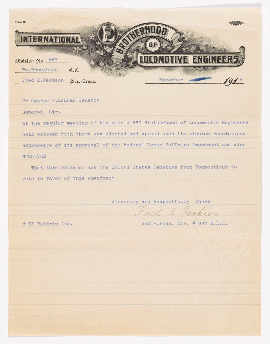 As labor organizations—like this Connecticut chapter of the International Brotherhood of Locomotive Engineers—voiced their desire for a woman suffrage amendment, support in Congress mounted. #19thAt100 #RightfullyHerspic.twitter.com/MswLnTkFpa