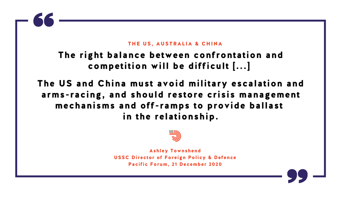 "The right balance between confrontation and competition will be difficult. Australia wants a strong US military presence and robust whole-of-government strategy but doesn’t want two regional hegemons one crisis from conflict." |