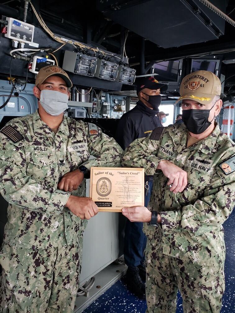 Congratulations to Monterey’s Sailors of the Quarter: OS1 Mosley (Sailor of the Quarter), FC2 Wilson (Junior Sailor of the Quarter), and HT3 Cruz Crespo (Blue Jacket of the Quarter). Well deserved Shipmates!