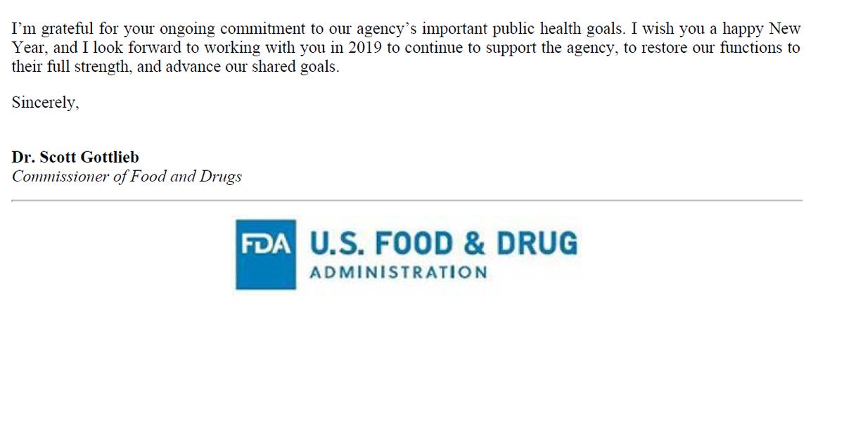 #FDA colleagues who were at their posts this week operating critical functions through the shutdown, and many more who are critical to our work but on furlough, I hope you have a peaceful New Years with family. I’m grateful for your dedication to our shared mission.pic.twitter.com/xdUQNEuxaT