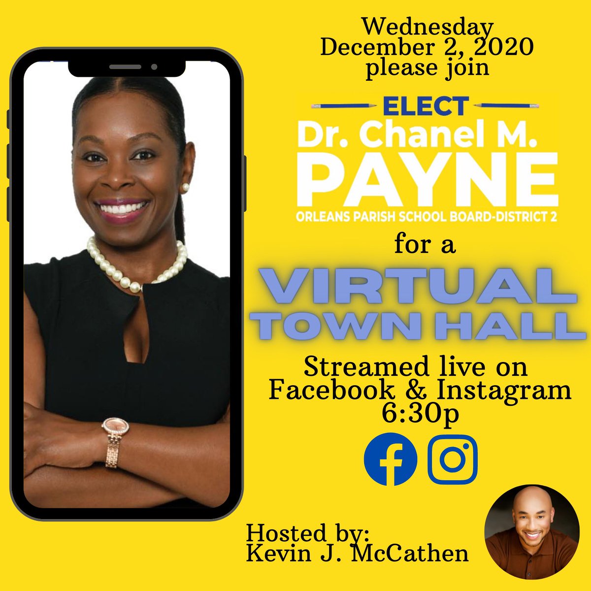 Join Dr. Chanel M. Payne today at 6:30pm for a Virtual Town Hall Meeting to discuss her candidacy for Orleans Parish School Board District 2. @ElectDrCMPayne @MJRockefeller #whenshewinswewin #itsamovement #thechildrenschamp #vote124 #itsarunoff #opsb2020 pic.twitter.com/6EPHL9danJ