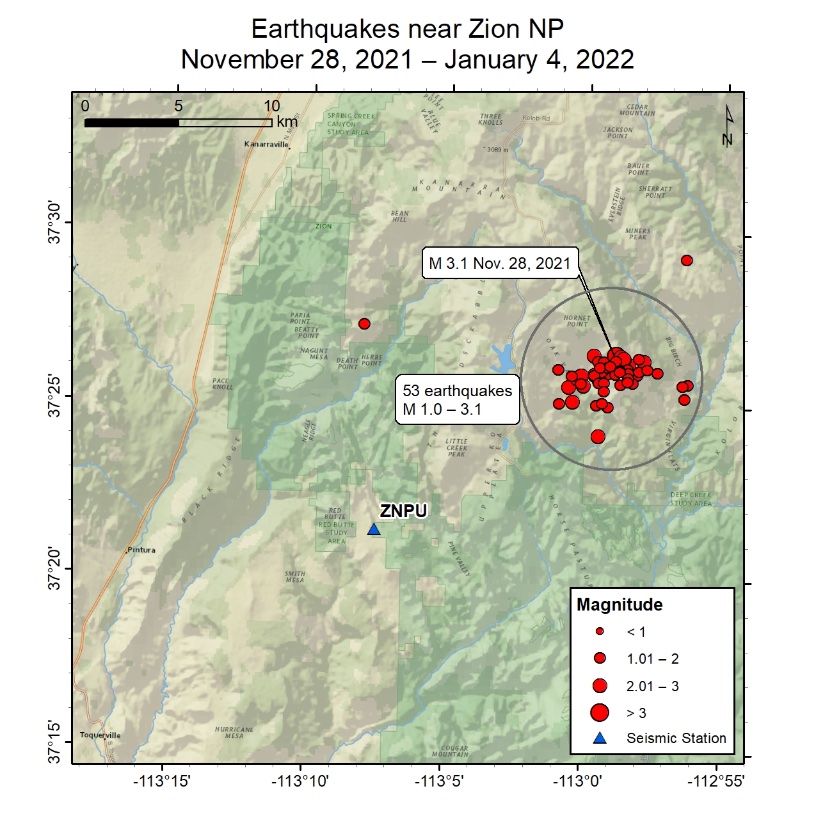 There is currently an ongoing earthquake sequence occurring in southern Utah, near Zion National Park. The sequence started November 28, 2021. To date, we have located 53 events. M3 = 1, M2 = 15, M<2 = 37.pic.twitter.com/aWcJ8BVpcq