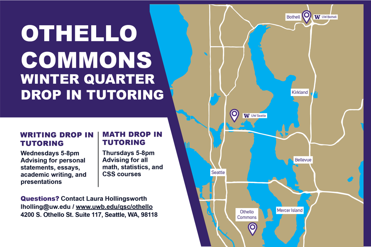 The Quantitative Skills Center (QSC) and Writing & Communications Center (WaCC) are available for regularly scheduled tutoring services in South Seattle at Othello-UW Commons for all UW Bothell students. More information available at http://uwb.edu/qsc/othello