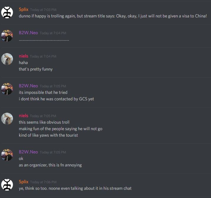 Have you guys at @Back2Warcraft heard that Happy won't be going to China because he can't get his visa approved? He said smt on his stream.