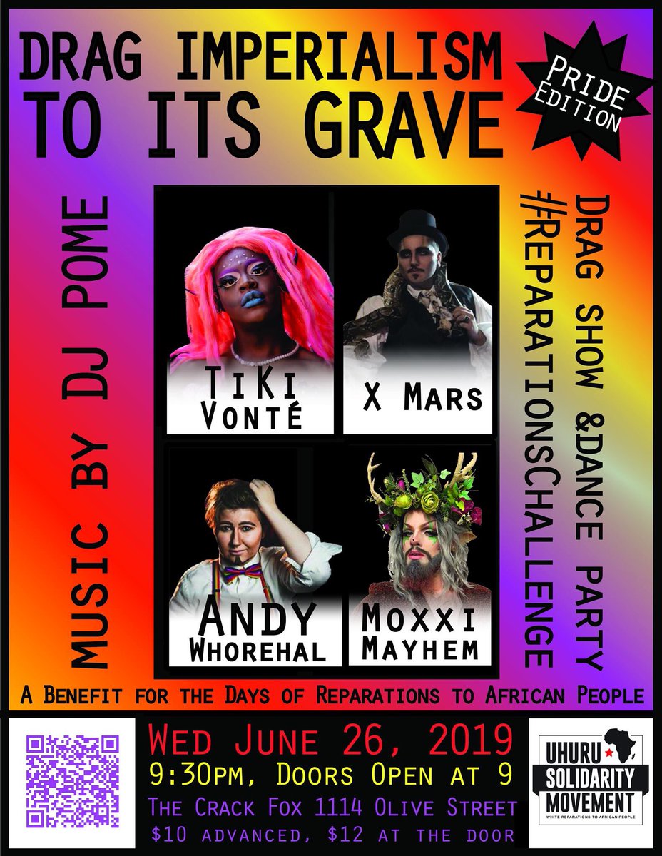 It's a drag show benefit in a mostly white community raising white reparations toward black empowerment and self-liberation, all organized by white people who are under the leadership of the African working class. White people have the money - a drag show is on way to get it.