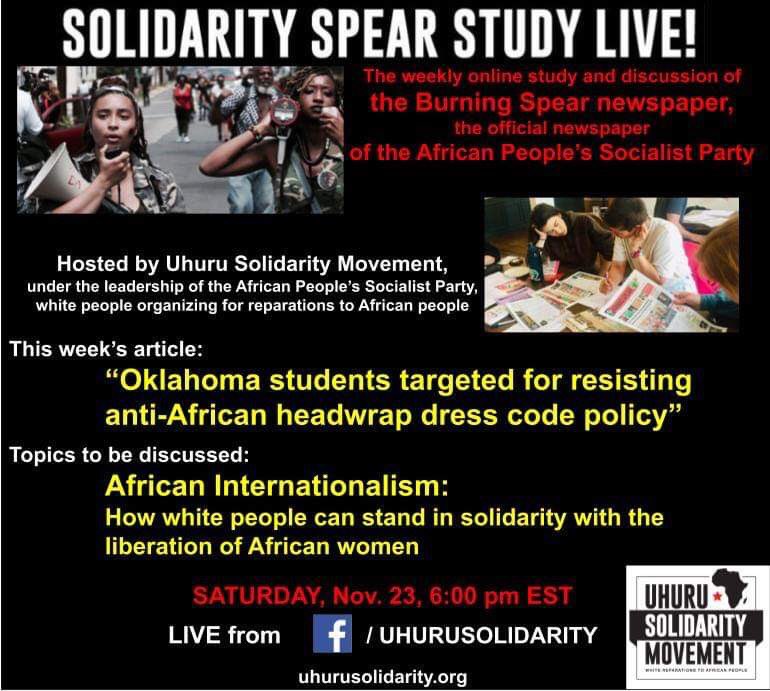 Tune in to the Solidarity Spear Study LIVE! Tomorrow, 6pm EST, addressing how white people can stand in solidarity with the liberation of African women. This study has a goal of #Reparations . How #AfricanInternationalism goes beyond #WhiteFeminism.pic.twitter.com/dqw3AAzX4H