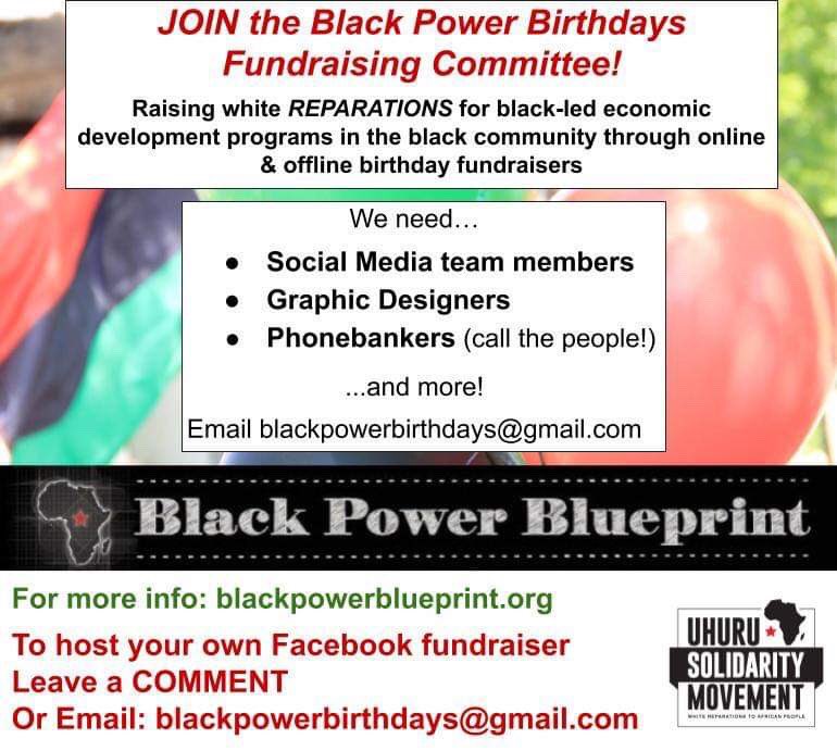 The Black Power Birthdays Fundraising Committee raises reparations for Black Power Blueprint thru helping members & supporters of USM host online or offline fundraisers, celebrating their birthday through #reparations!