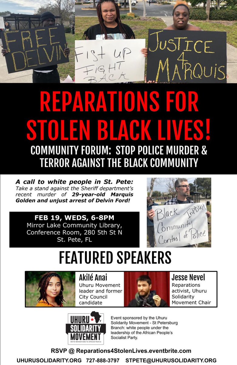 Tonight, USM, St Pete is hosting #Reparations for Stolen Black Lives: Community Forum: Stop #PoliceMurder & Terror Against the Black Community!