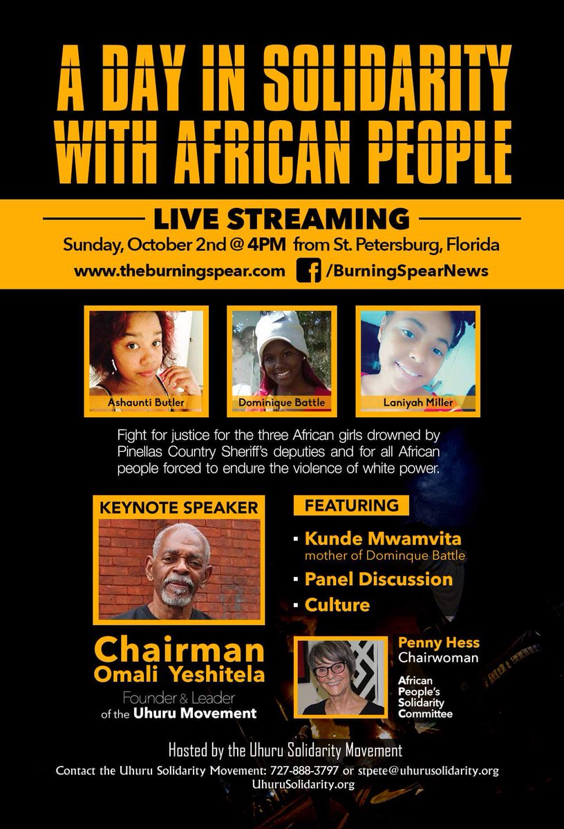 Tomorrow in St. Pete, FL! A Day in Solidarity with African People! Live streaming at http://TheBurningSpear.com pic.twitter.com/H16LzepUO3