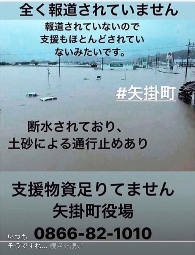 昨日テレビ朝日でも報道はされたようですが、SOSの通知が来ました。 シェアならびに支援お願いします 大きな浸水被害になった岡山県倉敷市に隣接する岡山県矢掛町では、小田川の堤防3カ所が決壊し、約600軒の住宅に浸水の被害が出ました。