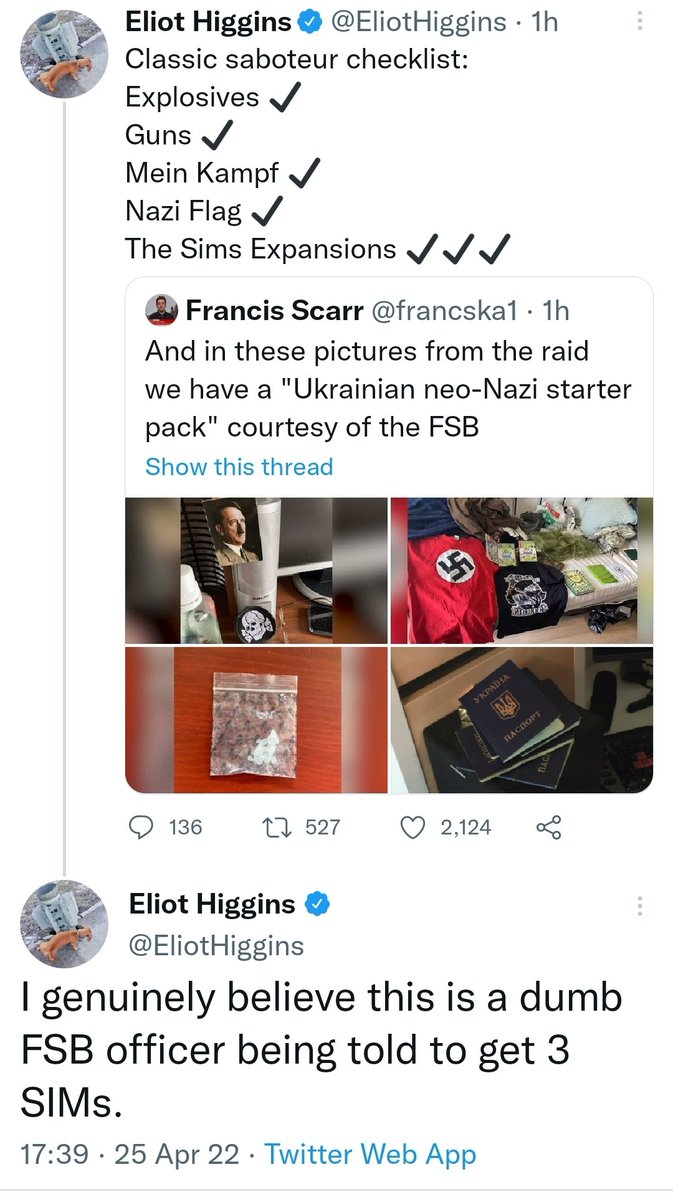 Ahahaha. Oh my God. The Russian FSB mocked up some fake Ukrainian Nazi assassins to foil but when stocking their villain lair, instead of buying 3 SIM cards, they bought three copies of The Sims. I'm crying.pic.twitter.com/kYOY3eyXWJ