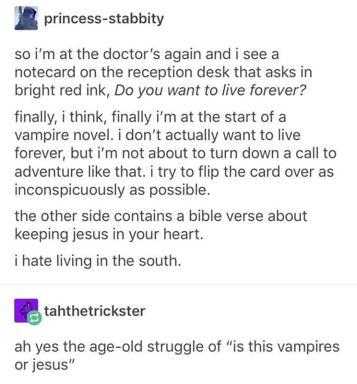 "Hello! Do you have a minute to talk about Dracula?" "No- wait, Dracula?" "Yes!" "You're vampires?" "Yes. We have pamphlets." "Vampires have missionaries?" "Where else would new vampires come from?" "I assumed you bit people." "There are many hurtful stereotypes. May we come in?"