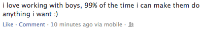 Just saw this status on Facebook. I really want to yell at her. Grr. Girls like this are part of the problem.pic.twitter.com/wmhWfFVK
