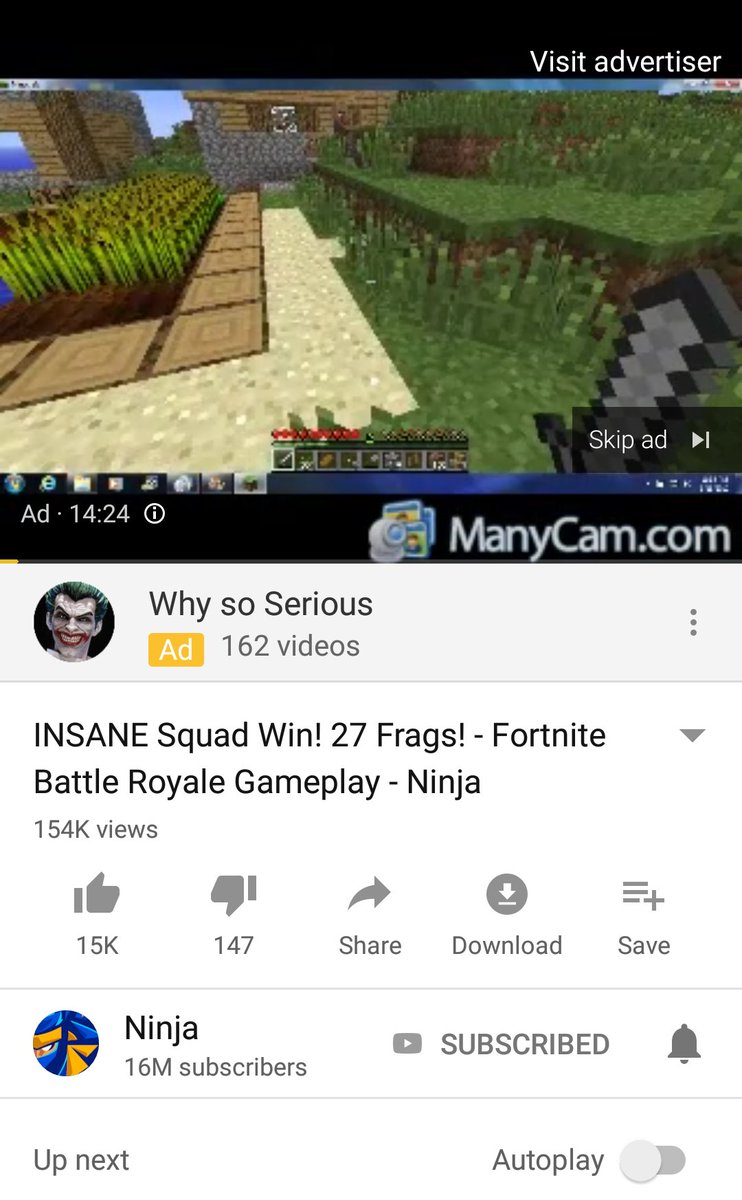 Why is there a 15 min. Minecraft AD. 😂😂 @ninja @TeamYouTubepic.twitter.com/ERZJPInJXH