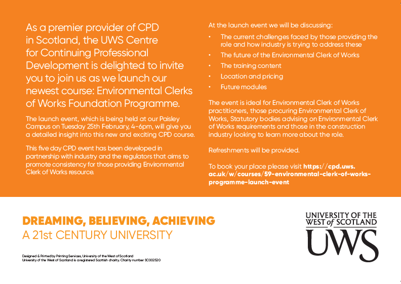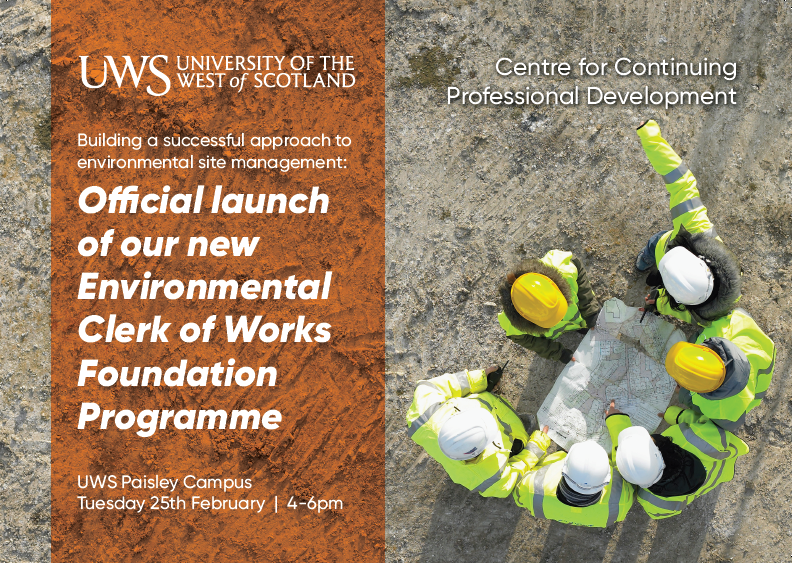 @UniWestScotland CPD course: Environmental Clerk of Works. This will be held on the Paisley Campus, 25th Feb at 4pm. Nibbles and refreshments provided.#Training#CPD#Environmentpic.twitter.com/6ZjyH9ndmd