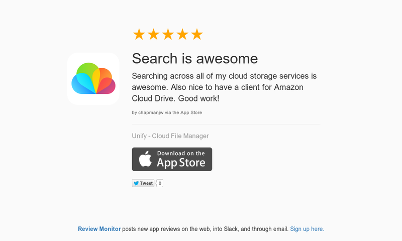 5 Star Review "Search is awesome: Searching across all of my cloud storage services is awes…" https://launchkit.io/reviews/Ij8OqzDXCag …pic.twitter.com/Vke2el5c5b