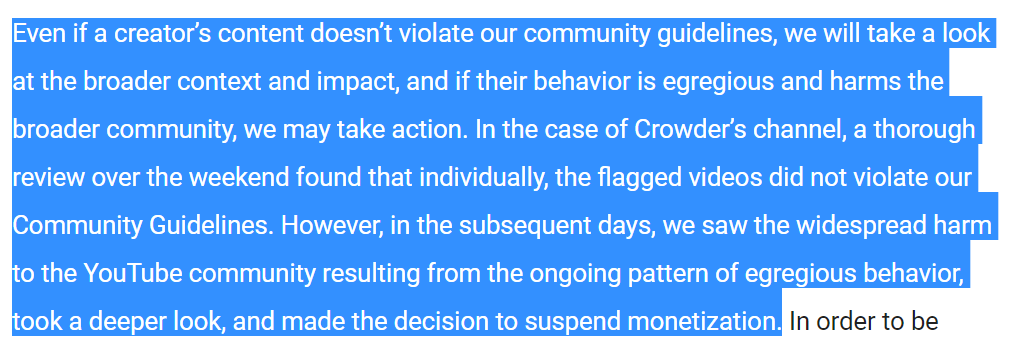 INCREDIBLE: In a brand new statement Youtube sets the BIZZARE standard that even if you DON'T break community guidelines, you can be disciplined if you stir up enough trouble for them in the press. Or as YT says "if behavior harms the broader community." 1/pic.twitter.com/mDvwV0tUX9