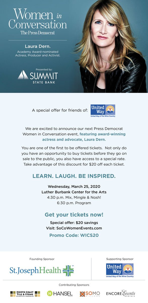 UWWC is the supporting sponsor of Sonoma County Women in Conversation featuring Laura Dern, 2020 Golden Globe winner, taking place on March 25. Visit http://socowomenevents.com/ to secure tickets using our promo code WICS20 & save $20/ticket. General ticket sales begin January 28.pic.twitter.com/QFrg8LLoyC