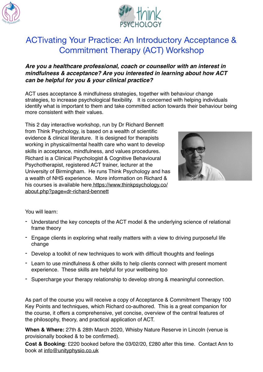 @thinkpsychol. Info below, get in touch with me if you would like to book.#pain#longtermconditions#healthcare#CPD#Lincoln#lincolnshire#newark#nottinghamshire#ACThttps://twitter.com/UnityPhysio/status/1221877979506147329 …