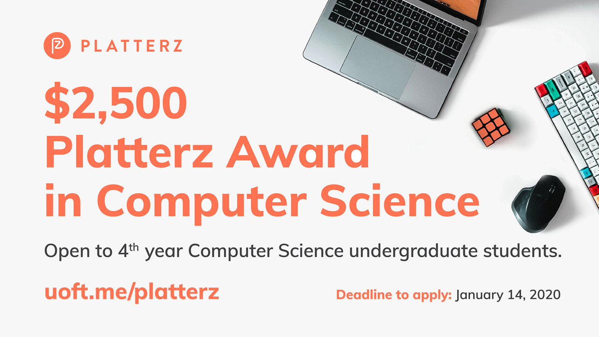 SCHOLARSHIP OPPORTUNITY! Calling all 4th year CS undergrads, a $2500 scholarship is available! Visit https://uoft.me/platterz for eligibility requirements and to apply. Deadline to apply is Jan 14, 2020 @ 11:59PM.pic.twitter.com/UGVPmyfy9b