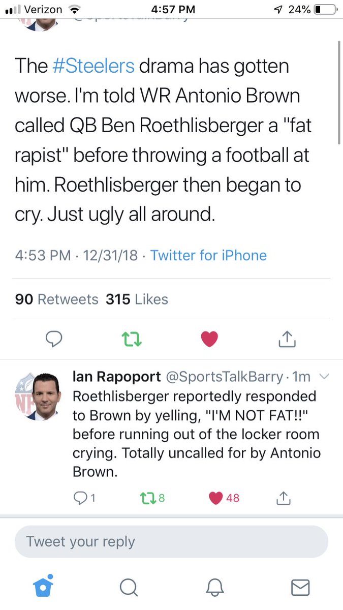 He did not attend Saturday’s walk-through practice and skipped the Saturday night meeting at the team hotel — the latest in missed meetings by the All-Pro receiver. Brown was never on the field for the start of the game against the Bengals and left Heinz Field at halftime.