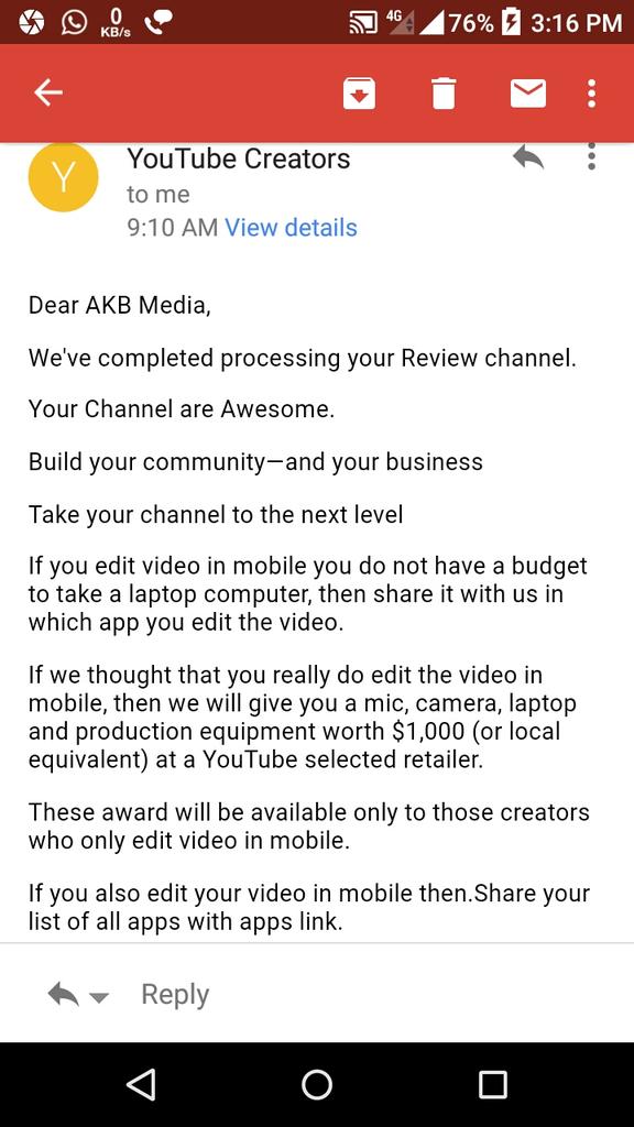 Dear YouTube Team I got this mail from YouTube creators.