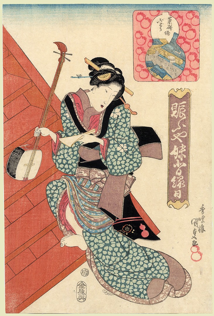 Kunisada / Toyokuni III Did she catch it, or is she using it for bait? Kanagawa Station: The Tomb of Urashima, from the mid-1840s series Fifty-three Pairings for the Tôkaidô Road