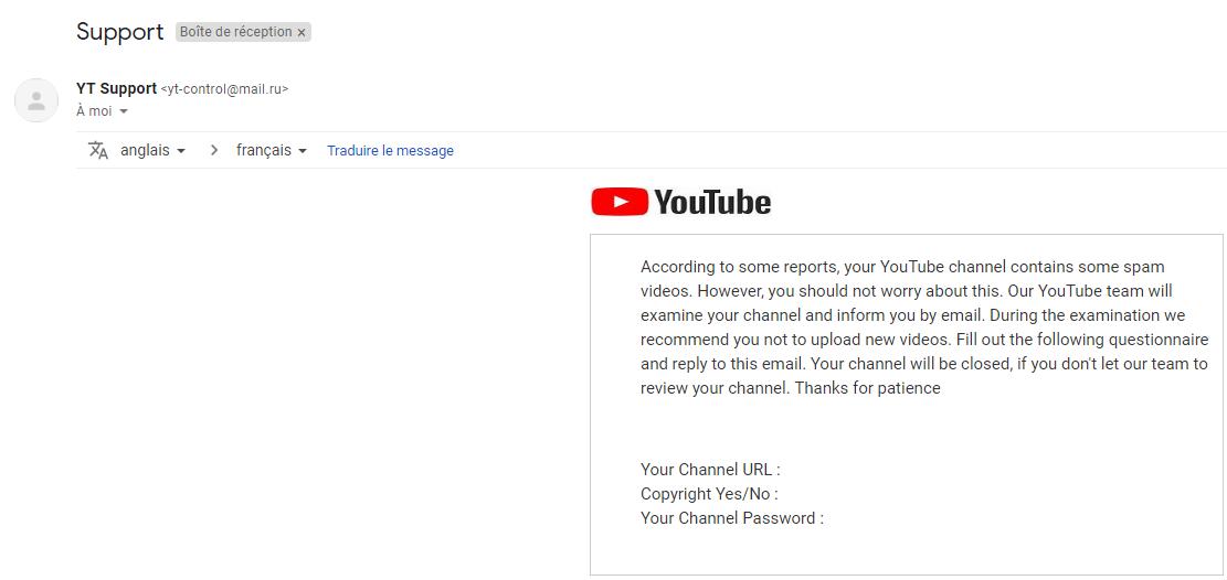 Amis et collègues #YouTubeurs, ne vous faites pas avoir par ce mail qui circule depuis quelques temps. Vérifiez toujours les adresses d'éxpediteurs au cas où~ ^^ @TeamYouTube @YouTube @TrustedSheriffpic.twitter.com/oRXJjsdvWT