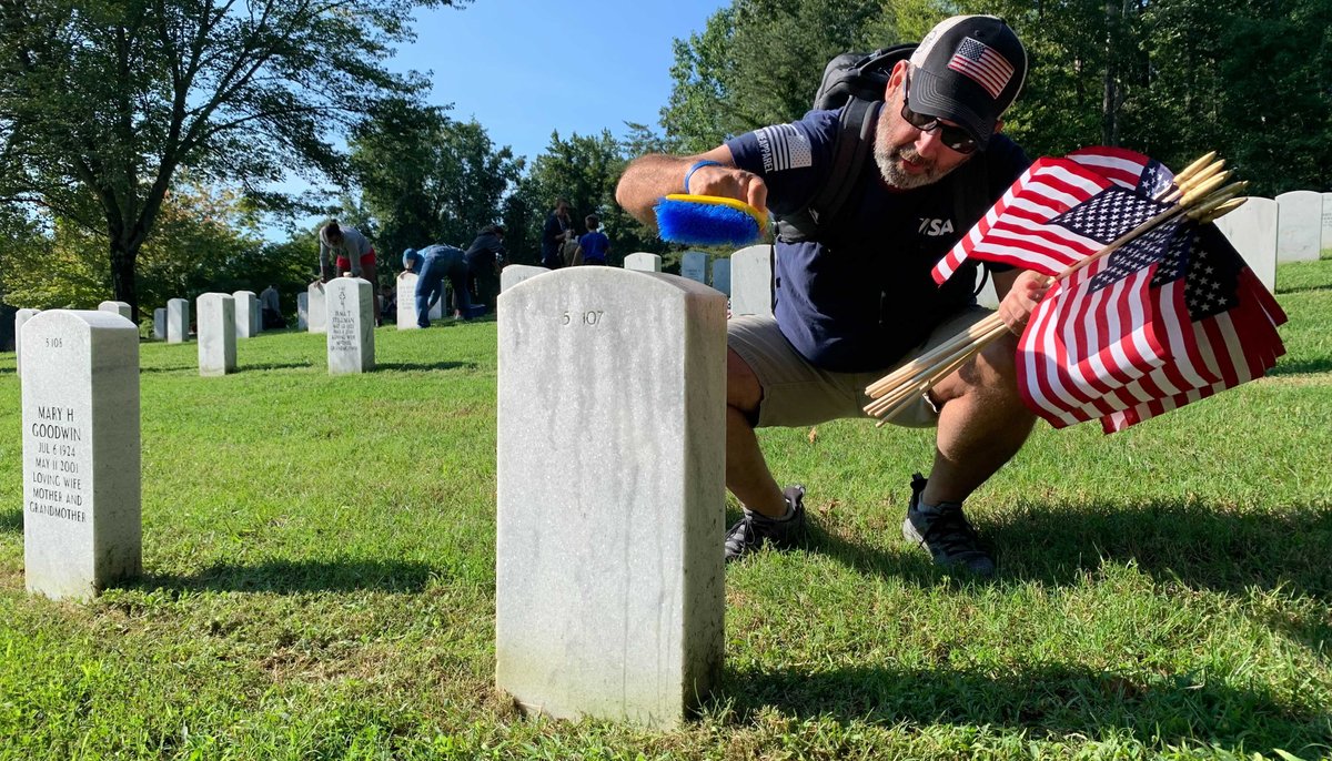 During the National Day of Service and Remembrance Sept. 10, Volunteers and VA senior leadership cleaned headstones at Alexandria National Cemetery in honor of those lost on 9/11.