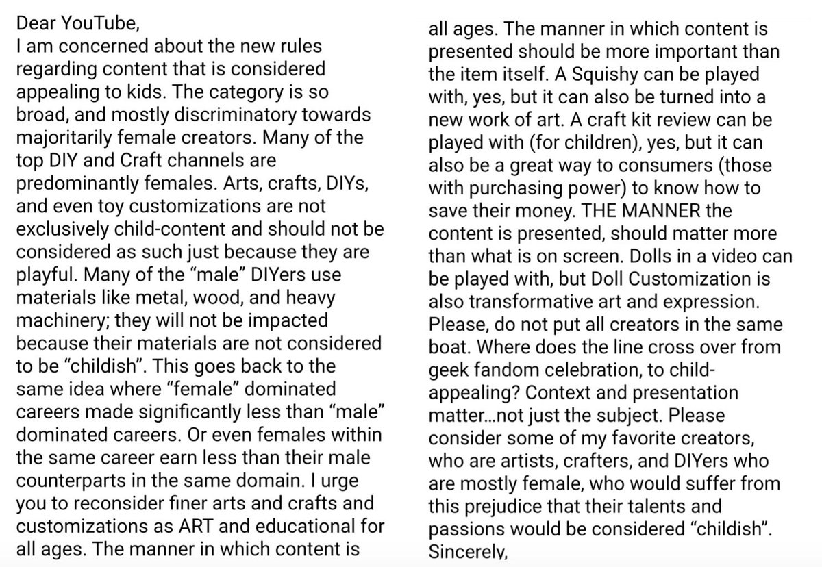 @youtube @teamyoutube Please seriously take a look at your criteria for child-content. You would vastly hurt artists that like to explore different medias, have a more cutesy art style, that work with popular characters, or have bright colored backdrops.#GirlyTopicsAreNotChildishpic.twitter.com/c2isR0lwb0