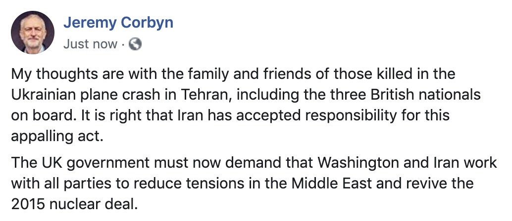 WTF??????????????????? The British citizens, along with 170 others, did not die in a crash. They were shot out of the sky by an Iranian missile. It is beyond comprehension that the Labour party offered this bloke up as its candidate to be PM last month.https://twitter.com/jeremycorbyn/status/1215999658310492160 …